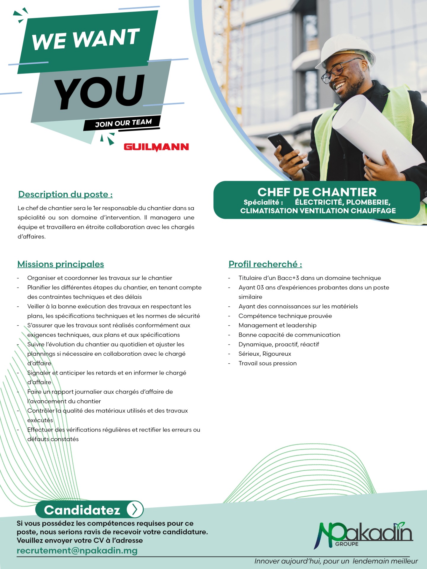 Le chef de chantier sera le 1er responsable du chantier dans sa spécialité ou son domaine d'intervention. Il manage une équipe et travaille en étroite collaboration avec les chargés d'affaires.